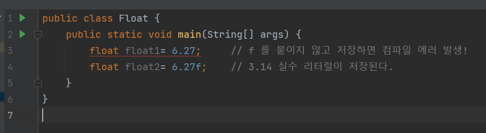 float float1= 6.27; // f 를 붙이지 않고 저장하면 컴파일 에러 발생!