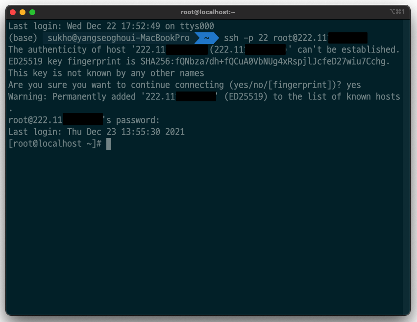 ssh -p 22 root@{아이피}